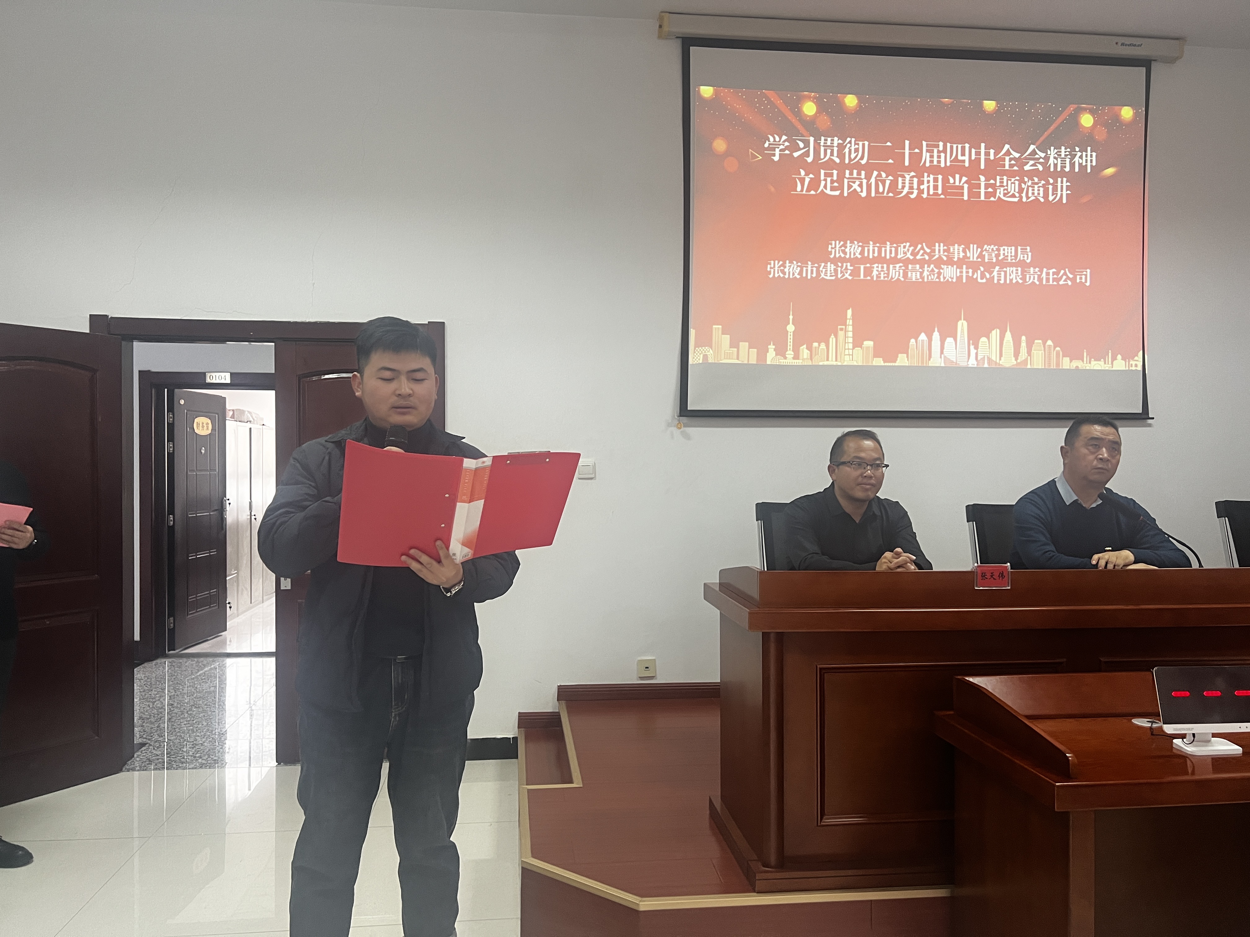 活动伊始,市政局主要领导作动员讲话,深刻阐述学习贯彻党的二十届四中全会精神的重大意义,结合张掖当日飘落的瑞雪,以“瑞雪映初心,清气满征程”寄语全体干部职工,勉励大家以竞赛的“火热”驱散冬寒,以演讲的“激情”凝聚力量,深刻领会全会关于国家治理体系和治理能力现代化的战略部署,把学习成果转化为推动市政局事业及检测中心工作高质量发展的实际动能,用心守护城市运行“生命线”,用情维系千家万户“烟火气”。